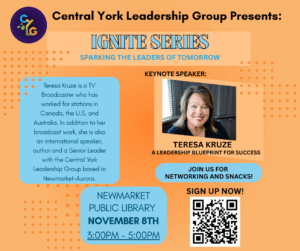 On Saturday, November 8th, Teresa Kruze will be speaking at the CYLG’s Ignite Series Event, Sparking Leaders of Tomorrow. She’ll share how young leaders can build their own Blueprint for Success and dive into a recent Harvard Business Review study that uncovers hidden mindsets that can hold leaders back and stop them from reaching their full potential.